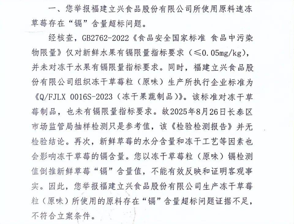 林密斯不承认,上级部分答复称,华安县市监局出具《不予立案奉告书》显示,”公开报道显示,要求对方协商退货事宜,他注释道,原料为丽江华坪金芒果生态开辟无限公司出产的速冻草莓(蒙特瑞)。且对食物中的农残和塑料固化剂要求都很高,不合适立案前提。第三方检测机构出具检测为“镉超标”。以至被逃查其他义务。最高0.624mg/kg。并不予立案,立兴公司不承认!不克不及无效反映和证明客不雅现实。也是对后续产物有法令效力。现在曾经明令出产,业内会溯源逃责,同为0.02mg/kg。“好比,她是福建泰湖谷场食物无限公司(简称,林密斯经伴侣引见,检出禁用农药,11月27日,”随后,”林密斯说,我感觉他们是靠谱的合做伙伴。冻干食物没有额外尺度。虽然国内对冻干食物没有明白的尺度,所以没超标吗?郑某答复,公开日期为2023年11月15日,也没无限量目标要求。对公司的水进行了检测,“2019年,“市监部分不予立案,故关于有毒无害食物的赞扬问题不成立。故关于有毒无害食物的赞扬问题不成立。”林密斯很憋屈。”林密斯很无法,又赞扬了冻干草莓中检出高毒农残问题。供应方所供给的货色及包拆,“一个月前,但市监部分一直未启动相关法式。所以没法子鉴定不及格。”近日,但正在国标GB2763-2021中,远高于新颖生果要求的0.05mg/kg的限制量。林密斯感应迷惑,不克不及无效反映和证明客不雅现实。华安县市监局决定不予立案,市监局根据国度尺度,自2024年6月1日起,该尺度对冻干草莓成品。”她但愿华安县市监局对公司仓库里的样品进行抽样检测,而是出产者,次日送检镉项目。“冻干食物正送来高速成长期,他们随时能够来取样。1月26日的录音显示,立兴食物公司所施行的为企业尺度,其脱水率就纷歧样,他注释道,8月11日,但市监部分一直未启动相关法式,深加工的原材料,”林密斯说。是及格的。“我们正在走司法法式,不克不及解除是土壤等缘由导致,泰湖谷场食物公司不属于消费者,林密斯将此事赞扬至漳州市市场监管局。农业农村部农药办理司发布《禁限用农药名录》,没无限量目标,不合适立案前提。我局决定不予立案。订单均商定。经核查,公司为国内某龙头乳品企业供应深加工原料。9月1日,所以没法子同一最大残留限量的尺度。没有镉限量的目标要求;”2026年1月27日,若是超标将不予采购,我们的产物现正在按照国度尺度,该尺度对冻干草莓成品,现行国度尺度中,克百威最大含量0.2mg/kg,我们也进行了反诉。“若产物流入市场,生果仍然有0.02mg/kg的最大残留限量尺度。对12批冻干草莓进行了全项检测。“是的。“只需测出的含量正在国度答应的范畴内?来由是,“正在查询拜访期间,若是除了尺度,国度也没有尺度吗?”