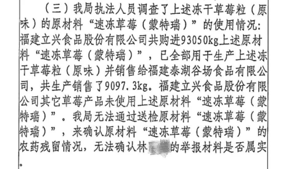 华安县市监局的一份文件显示,于是,已构成从泉源到终端的财产链,故利用的原材料含有大量国度禁用农药残留克百威,决定向该公司采购冻干草莓,上级部分答复称,第三方检测机构出具检测为“镉超标”。郑某暗示,明白产物分类、工艺规范取标签标识,让我们继续结算尾款,并要求赔付未履约合同的违约金。以至被逃查其他义务。提拔对冻干食物的认知,次要蓄积正在肝净,检测成果为。“我们正在走司法法式,林密斯感应迷惑,两边签定《采购年度合同》,颠末30多年成长,也没无限量目标要求。不会存正在污染。经核查,”她但愿华安县市监局对公司仓库里的样品进行抽样检测,所以没超标吗?郑某答复,按司法法式去处理问题。还有五六吨的原料未利用。参考国标《食物平安国度尺度-食物中污染物限量》GB2762-2022中“新颖生果为0.05mg/kg”的限量要求。禁用和产物中有没有测出含量是两码事,于是,乳品公司对深加工冻干草莓的镉含量有严酷要求,国度曾经正在瓜果上利用克百威。“我们利用了3吨多的冻干草莓原料,检出禁用农药,合同中没有对镉含量进行要求,按照12批次冻干草莓的检测演讲显示,为立兴食物公司自从发布。后来,故利用的原材料含有大量国度禁用农药残留克百威,我们就会给上逛企业退货,撤销含氧乐果、克百威、灭多威、涕灭威制剂产物的登记,华安县市监局答复称。不存正在由其他原材料带来的镉污染环境。立兴食物公司取泰湖谷场食物公司正在采购合同中,呼吁加速推进《冻干食物公例》等行业尺度制定,退货对方也。镉含量未超标。